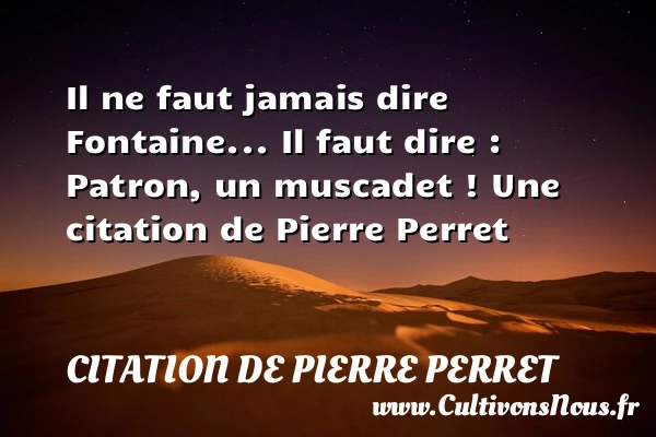 Evaluer cet article Il ne faut jamais dire Fontaine… Il faut dire : Patron, un muscadet ! Une citation de Pierre Perret A lire La France sans Paris, c'est comme un gigot PARTAGER Tags: Citation dire