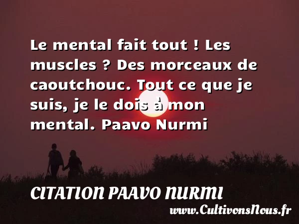 Evaluer cet article Le mental fait tout ! Les muscles ? Des morceaux de caoutchouc. Tout ce que je suis, je le dois à mon mental. Paavo Nurmi A lire Je suis une légende PARTAGER Tags: Citation athlèteCitation jeux olympiques
