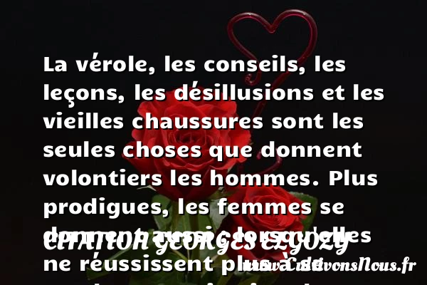 La vérole, les conseils, les leçons, les désillusions et les vieilles chaussures sont les seules choses que donnent volontiers les hommes. Plus prodigues, les femmes se donnent aussi ; lorsqu’elles ne réussissent plus à se vendre.