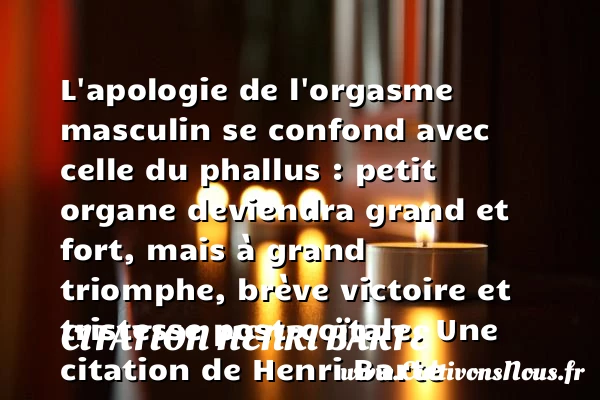 L’apologie de l’orgasme masculin se confond avec celle du phallus : petit organe deviendra grand et fort, mais à grand triomphe, brève victoire et tristesse post-coïtale.