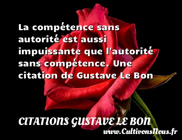 Evaluer cet article La compétence sans autorité est aussi impuissante que l’autorité sans compétence. Une citation de Gustave Le Bon A lire L'enfant venant à la lumière PARTAGER Tags: Citation santé