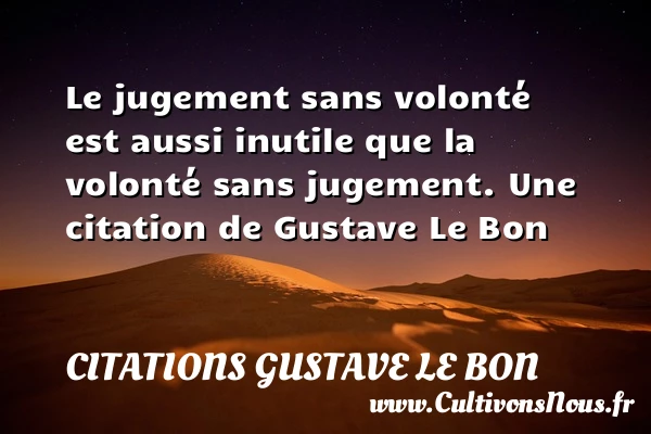 Evaluer cet article Le jugement sans volonté est aussi inutile que la volonté sans jugement. Une citation de Gustave Le Bon A lire La compétence sans autorité est aussi impuissante que l'autorité sans PARTAGER