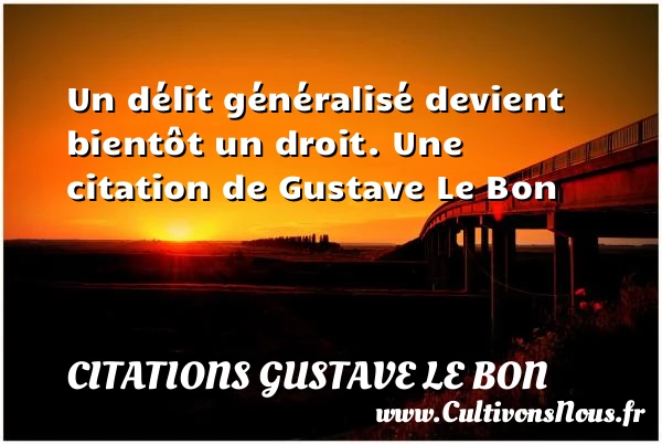 Evaluer cet article Un délit généralisé devient bientôt un droit. Une citation de Gustave Le Bon A lire Présentée sous forme mathématique, l'erreur acquiert un grand prestige. PARTAGER