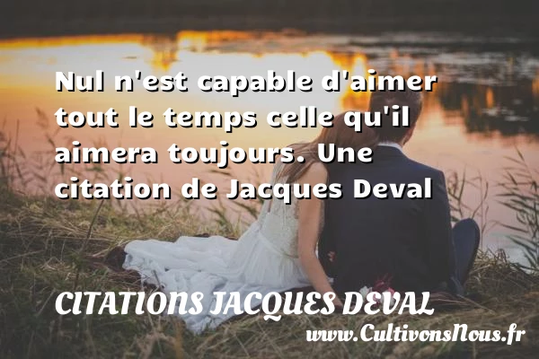 Evaluer cet article Nul n’est capable d’aimer tout le temps celle qu’il aimera toujours. Une citation de Jacques Deval A lire Une femme peut fort bien porter une robe de bal sans savoir danser, une PARTAGER