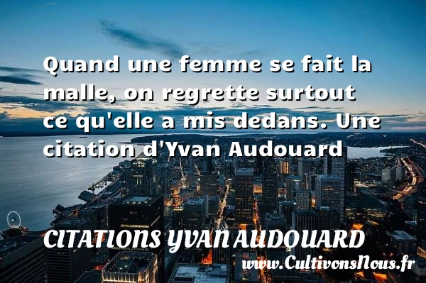 Evaluer cet article Quand une femme se fait la malle, on regrette surtout ce qu’elle a mis dedans. Une citation d’Yvan Audouard A lire On préfère plutôt regarder les fleurs pousser que PARTAGER Tags: Citation regret