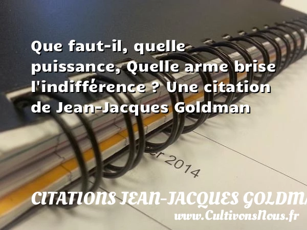 Evaluer cet article Que faut-il, quelle puissance, Quelle arme brise l’indifférence ? Une citation de Jean-Jacques Goldman A lire J'étais parti pour me trouver, je ne reviens PARTAGER