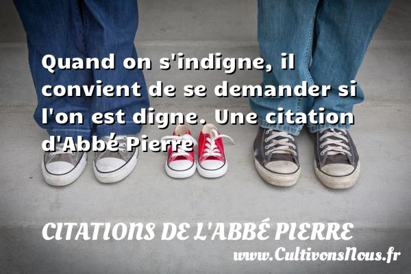 Evaluer cet article Quand on s’indigne, il convient de se demander si l’on est digne. Une citation d’Abbé Pierre A lire Les hommes se déchirent non par ce qu'ils PARTAGER