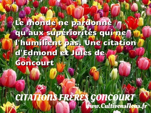 Evaluer cet article Le monde ne pardonne qu’aux supériorités qui ne l’humilient pas. Une citation d’Edmond et Jules de Goncourt A lire C'était une bonne chose que cette habitude ancienne PARTAGER