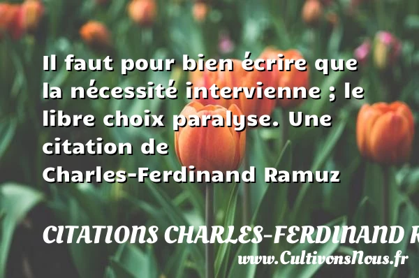 Evaluer cet article Il faut pour bien écrire que la nécessité intervienne ; le libre choix paralyse. Une citation de Charles-Ferdinand Ramuz A lire Il s'agirait de voir jusqu'à quel point vont aller nos pouvoirs, à nous PARTAGER