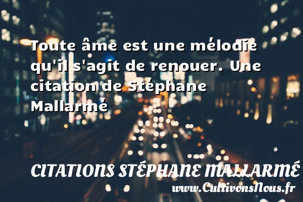 Evaluer cet article Toute âme est une mélodie qu’il s’agit de renouer. Une citation de Stéphane Mallarmé A lire Extase des regards, scintillement des nimbes ! PARTAGER