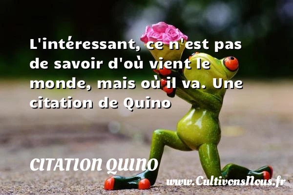 Evaluer cet article L’intéressant, ce n’est pas de savoir d’où vient le monde, mais où il va. Une citation de Quino A lire La savoir est la parure du riche et la richesse du PARTAGER Tags: Citation savoir