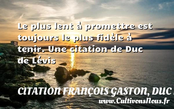 Evaluer cet article Le plus lent à promettre est toujours le plus fidèle à tenir. Une citation de Duc de Lévis A lire Rarement ce que l'on entend pas sans peine vaut-il la PARTAGER