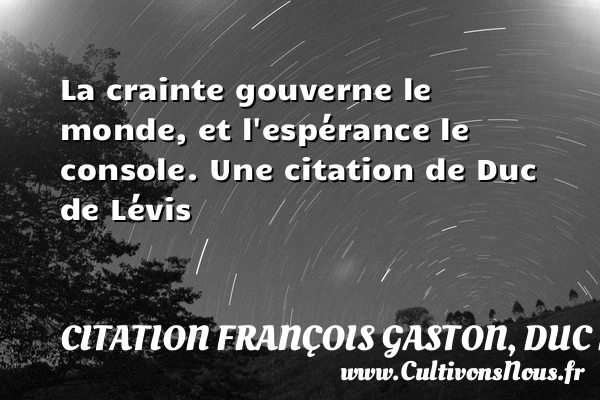 Evaluer cet article La crainte gouverne le monde, et l’espérance le console. Une citation de Duc de Lévis A lire Quand une conjuration échoue par l'effet du hasard, il est PARTAGER