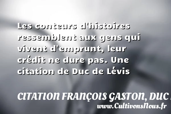 Evaluer cet article Les conteurs d’histoires ressemblent aux gens qui vivent d’emprunt, leur crédit ne dure pas. Une citation de Duc de Lévis A lire Le plus lent à promettre est toujours le plus fidèle à tenir. PARTAGER