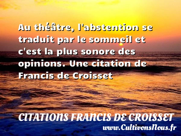Evaluer cet article Au théâtre, l’abstention se traduit par le sommeil et c’est la plus sonore des opinions. Une citation de Francis de Croisset A lire Un homme qui vous aimait PARTAGER