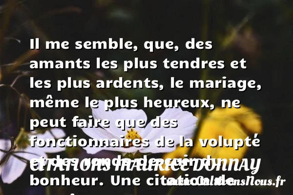 Il me semble, que, des amants les plus tendres et les plus ardents, le mariage, même le plus heureux, ne peut faire que des fonctionnaires de la volupté et des ronds-de-cuir du bonheur.