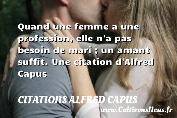 Evaluer cet article Quand une femme a une profession, elle n’a pas besoin de mari ; un amant suffit. Une citation d’Alfred Capus A lire L'amour est-il, comme on le prétend, la purification PARTAGER