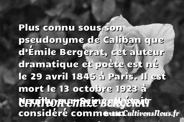 Plus connu sous son pseudonyme de Caliban que d’Émile Bergerat, cet auteur dramatique et poète est né le 29 avril 1845 à Paris. Il est mort le 13 octobre 1923 à Neuilly-sur-Seine. Il était considéré comme un excellent chroniqueur ayant un esprit verveux et paradoxal.