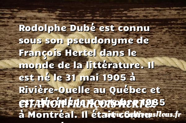 Rodolphe Dubé est connu sous son pseudonyme de François Hertel dans le monde de la littérature. Il est né le 31 mai 1905 à Rivière-Ouelle au Québec et est décédé le 4 octobre 1985 à Montréal. Il était connu comme étant un dramaturge, un poète et un écrivain canadien. Il a aussi été philosophe, mémorialiste, professeur et prêtre.