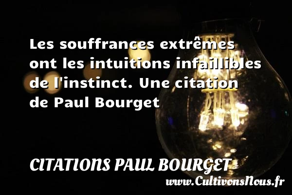 Evaluer cet article Les souffrances extrêmes ont les intuitions infaillibles de l’instinct. Une citation de Paul Bourget A lire Le flirt est l'aquarelle de l'amour. PARTAGER