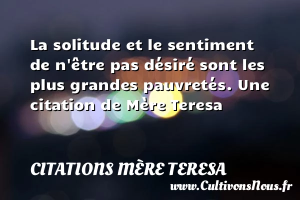 Evaluer cet article La solitude et le sentiment de n’être pas désiré sont les plus grandes pauvretés. Une citation de Mère Teresa A lire Que pouvez-vous faire pour PARTAGER Tags: Citations désir