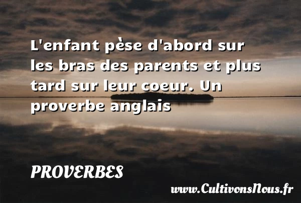 4.7/5 - (4 votes) L’enfant pèse d’abord sur les bras des parents et plus tard sur leur coeur. Un proverbe anglais A lire La variété est l'épice de PARTAGER Tags: proverbe enfant
