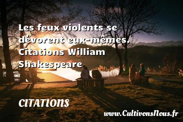 4.2/5 - (4 votes) Les feux violents se dévorent eux-mêmes. Citations William Shakespeare A lire La vraie valeur d'un homme PARTAGER