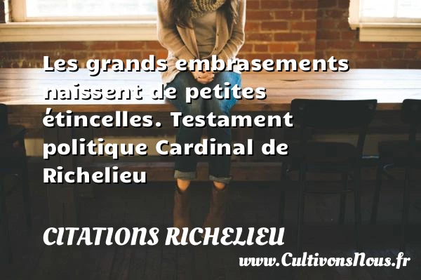 4.8/5 - (5 votes) Les grands embrasements naissent de petites étincelles. Testament politique Cardinal de Richelieu A lire Pour tromper un rival PARTAGER