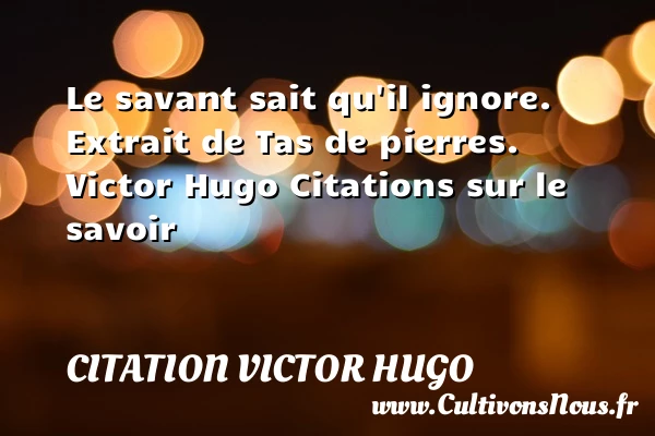 4.3/5 - (7 votes) Le savant sait qu’il ignore. Extrait de Tas de pierres. Victor Hugo Citations sur le savoir A lire Il faut que le droit PARTAGER