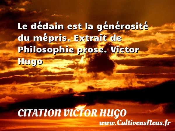 4.4/5 - (5 votes) Le dédain est la générosité du mépris. Extrait de Philosophie prose. Victor Hugo A lire Il y a une différence entre un PARTAGER