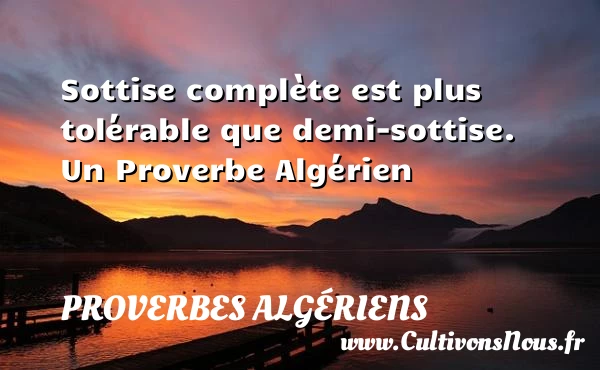 Evaluer cet article Sottise complète est plus tolérable que demi-sottise. Un Proverbe Algérien A lire L'Algérie PARTAGER Tags: Proverbes philosophiques