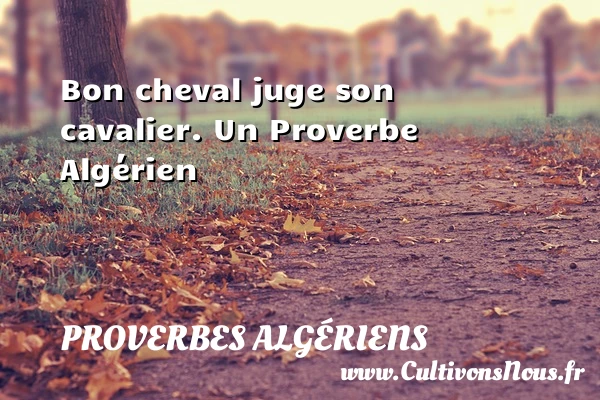 Evaluer cet article Bon cheval juge son cavalier. Un Proverbe Algérien A lire La mesure de la hauteur, est celle de PARTAGER Tags: Proverbes philosophiques