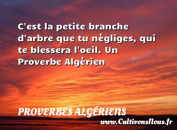 Evaluer cet article C’est la petite branche d’arbre que tu négliges, qui te blessera l’oeil. Un Proverbe Algérien A lire Les hommes ont besoin les uns des autres,heureux celui qui n'a PARTAGER Tags: Proverbes philosophiques