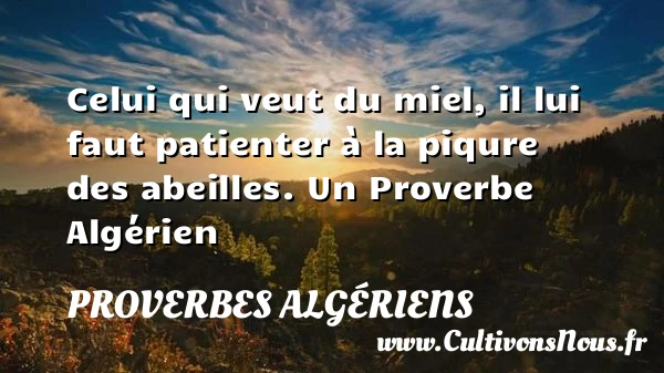 Evaluer cet article Celui qui veut du miel, il lui faut patienter à la piqure des abeilles. Un Proverbe Algérien A lire Lorsqu'on attend après son voisin pour dîner, on dîne bien PARTAGER Tags: Proverbes fun