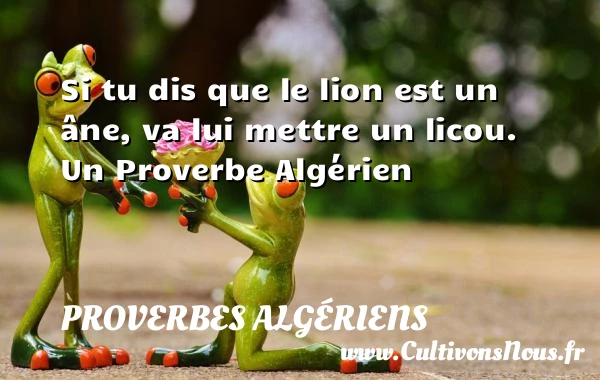Evaluer cet article Si tu dis que le lion est un âne, va lui mettre un licou. Un Proverbe Algérien A lire Les enfants des hommes sages cuisinent avant d'avoir PARTAGER Tags: Proverbes philosophiques