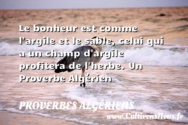 Evaluer cet article Le bonheur est comme l’argile et le sable, celui qui a un champ d’argile profitera de l’herbe. Un Proverbe Algérien A lire Celui qui ne veut pas se contenter d'un pain (ce qu'il PARTAGER Tags: Proverbes philosophiques