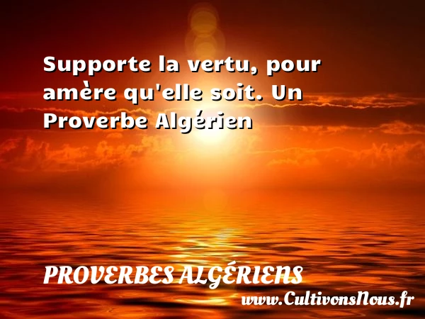 Evaluer cet article Supporte la vertu, pour amère qu’elle soit. Un Proverbe Algérien A lire Supporte la vertu, pour PARTAGER Tags: Proverbes vertu