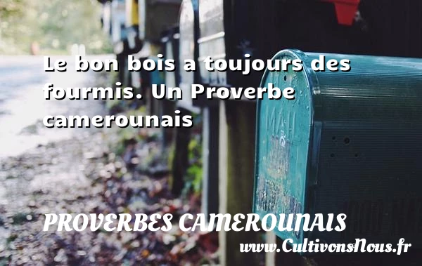 Evaluer cet article Le bon bois a toujours des fourmis. Un Proverbe camerounais A lire Vaincu, on sera réduit en cendres ; vainqueur, PARTAGER Tags: Proverbe bois