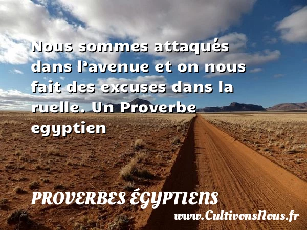 Evaluer cet article Nous sommes attaqués dans l’avenue et on nous fait des excuses dans la ruelle. Un Proverbe egyptien A lire Une vue splendide n'a aucun charme si la PARTAGER Tags: Proverbes philosophiques