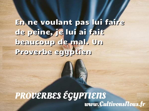 Evaluer cet article En ne voulant pas lui faire de peine, je lui ai fait beaucoup de mal. Un Proverbe egyptien A lire S’il te donne sa terre, facture-lui la semence. PARTAGER Tags: Proverbes philosophiques