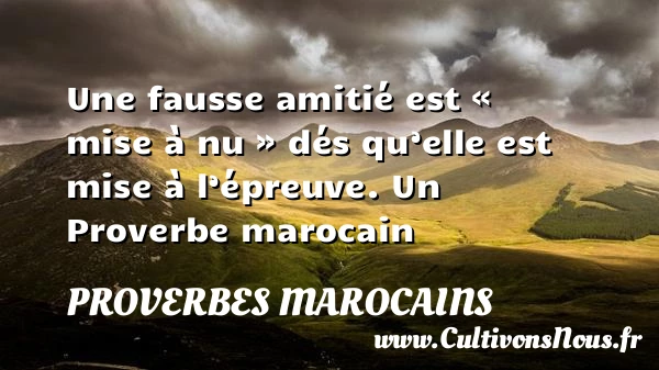 Evaluer cet article Une fausse amitié est « mise à nu » dés qu’elle est mise à l’épreuve. Un Proverbe marocain A lire Bien réfléchir avant d'agir. PARTAGER Tags: Proverbes connusProverbes philosophiques