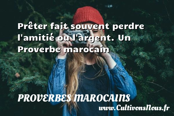 Evaluer cet article Prêter fait souvent perdre l’amitié ou l’argent. Un Proverbe marocain A lire Les années en savent plus que les livres. PARTAGER Tags: Proverbes philosophiques