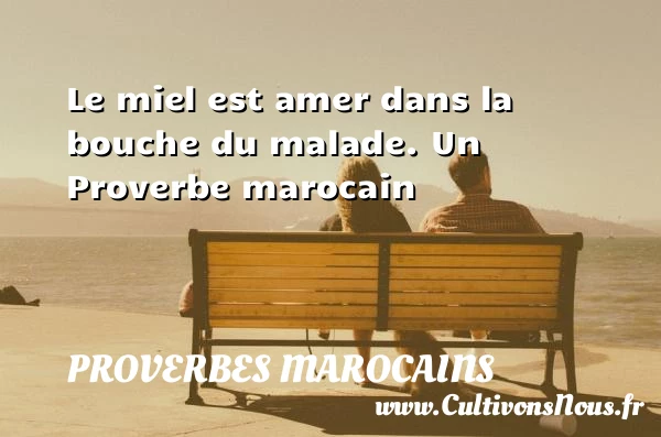 Evaluer cet article Le miel est amer dans la bouche du malade. Un Proverbe marocain A lire L’orphelin, même vieillard, fait couler mes larmes. PARTAGER Tags: Proverbes philosophiques