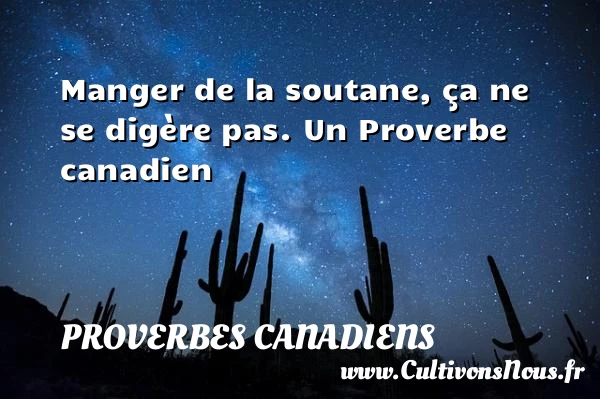 Evaluer cet article Manger de la soutane, ça ne se digère pas. Un Proverbe canadien A lire Il ne faut pas déshabiller Pierre pour habiller PARTAGER Tags: Proverbes philosophiques