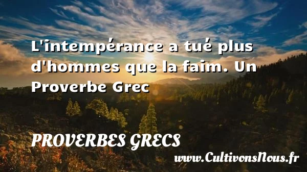 Evaluer cet article L’intempérance a tué plus d’hommes que la faim. Un Proverbe Grec A lire Le meilleur repas est celui où l'on est bien PARTAGER Tags: Proverbes connus
