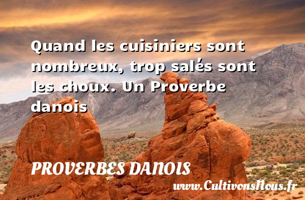 Evaluer cet article Quand les cuisiniers sont nombreux, trop salés sont les choux. Un Proverbe danois A lire Le plus sage est celui qui sait céder. PARTAGER Tags: Proverbes philosophiques