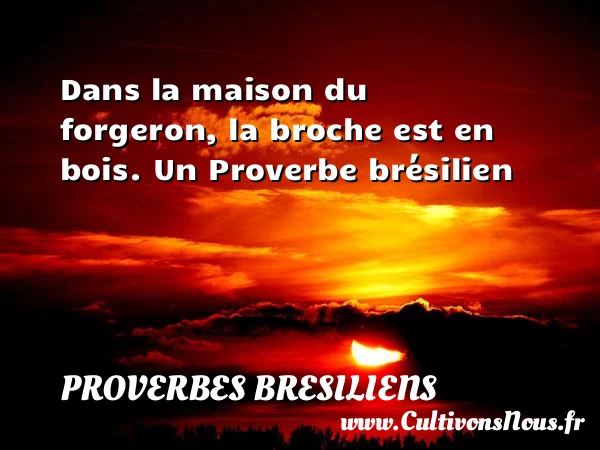 5/5 - (7 votes) Dans la maison du forgeron, la broche est en bois. Un Proverbe brésilien A lire La bonne volonté raccourcit le chemin. PARTAGER Tags: Proverbes philosophiques