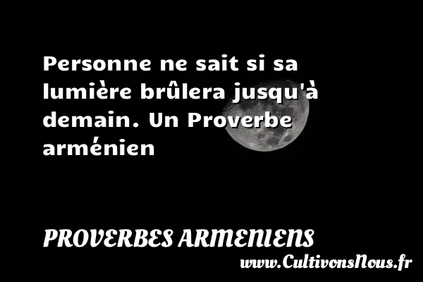Evaluer cet article Personne ne sait si sa lumière brûlera jusqu’à demain. Un Proverbe arménien A lire Si ta machette ne veux pas tailler les épineux, demande-lui PARTAGER Tags: Proverbes philosophiques