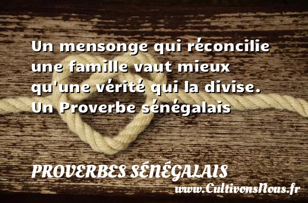 Evaluer cet article Un mensonge qui réconcilie une famille vaut mieux qu’une vérité qui la divise. Un Proverbe sénégalais A lire Qui attend longtemps au puits finira par y trouver PARTAGER Tags: Proverbes philosophiques