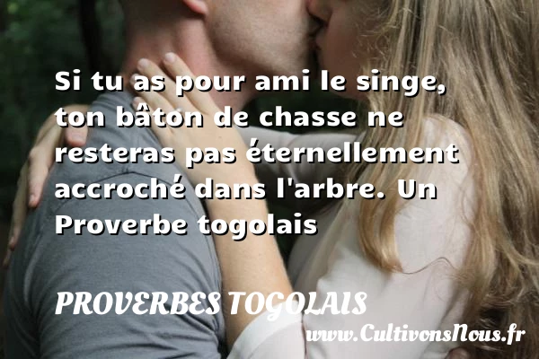 Evaluer cet article Si tu as pour ami le singe, ton bâton de chasse ne resteras pas éternellement accroché dans l’arbre. Un Proverbe togolais A lire Le plus fou est celui qui prend les PARTAGER Tags: Proverbes philosophiques